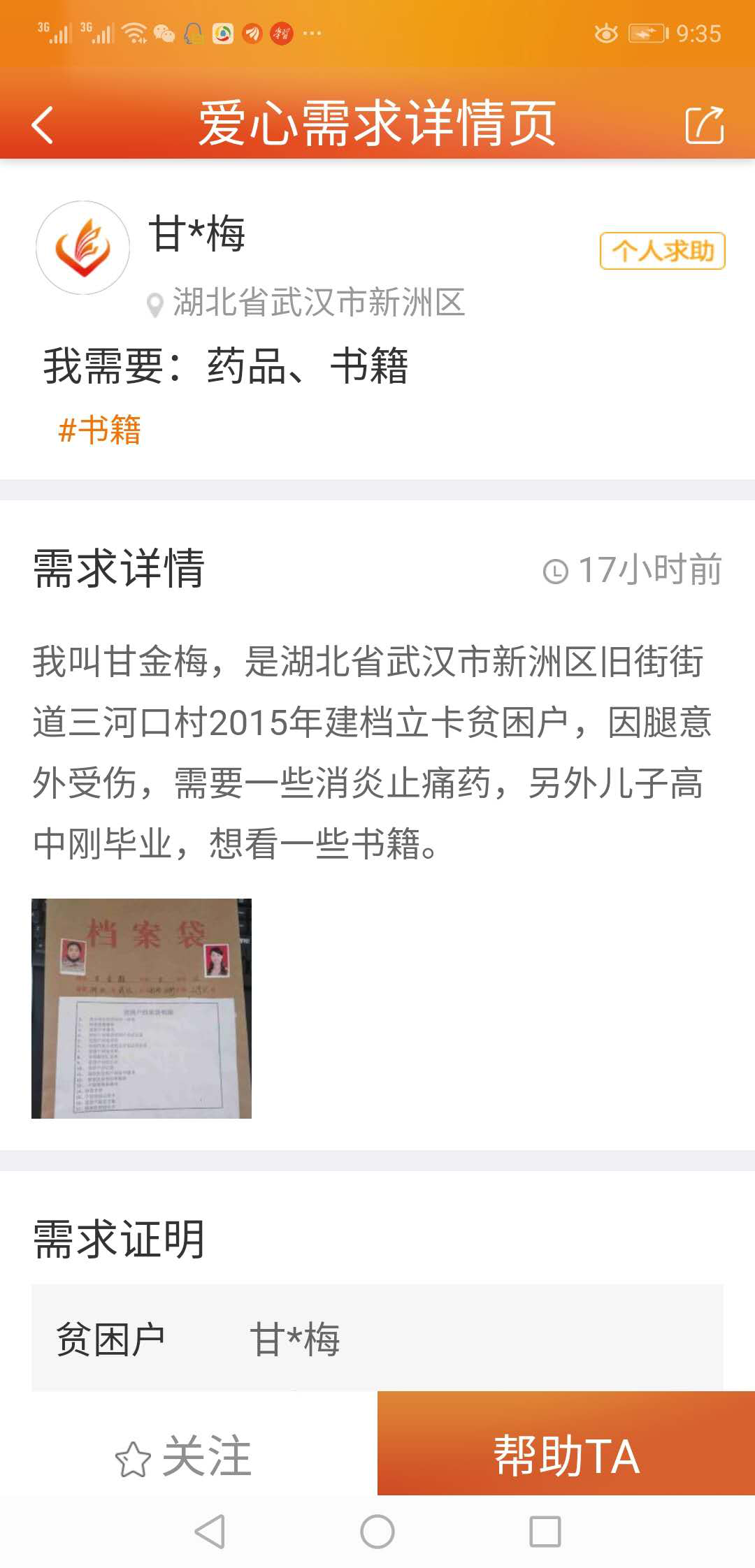 长江日报融媒体讯 (通讯员陆威克)6月18日,贫困户甘金梅在中国社会扶贫网发出:因腿意外受伤,需要消炎药,另外,孩子高中刚毕业,想看一些书。求助信息发出一天后,驻村工作队长张建平就把消炎药和书送到了武汉市新洲区旧街街三河口村贫困户甘金梅家中。甘金梅激动地说:“党的政策好,网上发布信息快,好心干部多,脱贫后让我的生活越来越好,越来越有奔头!”