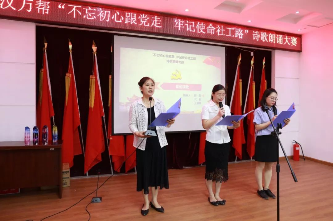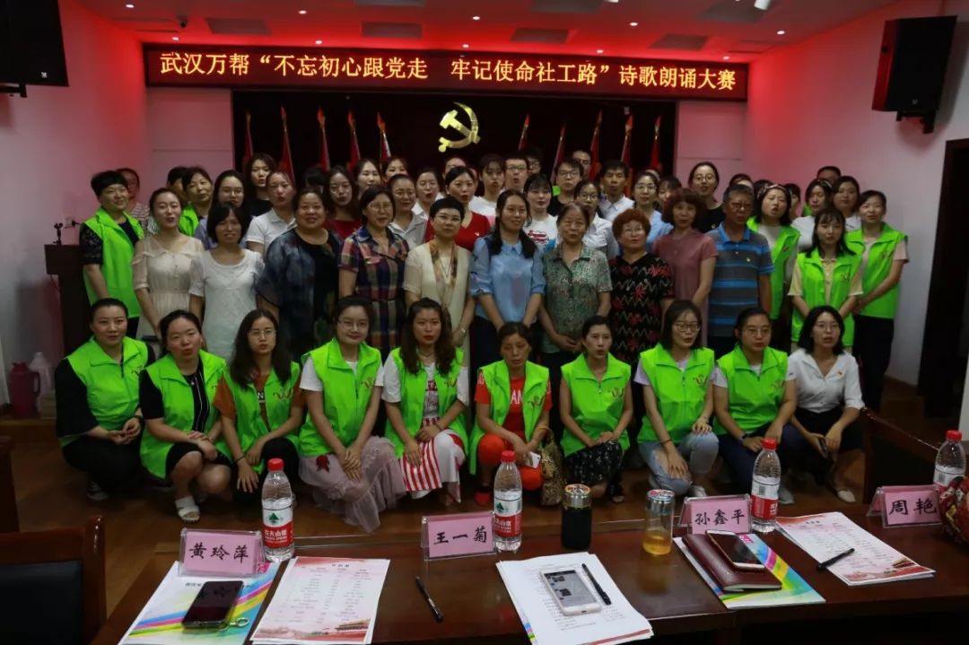 长江日报融媒体讯(通讯员 汪万军 范容)06月26日上午,在洪山区关山街道办事处一楼会议室,关山街与武汉万帮社会工作服务中心联合举办了“不忘初心跟党走,牢记使命社工路”的诗歌朗诵大赛,万帮社工们用诗歌咏颂爱国之情,咏颂服务情怀,向党的生日献礼。
