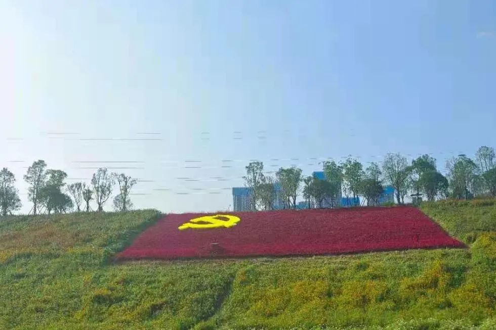 在离武汉站不远处的北洋桥中央生态公园南坡面,一面长30米、宽20米的巨幅时花党旗气光彩夺目,向往来欢乐大道高架的司机乘客闪耀出熠熠光辉。在市、区园林局及市环投集团的倡议指导下,武汉市花木公司用5万盆凤尾鸡冠花做旗帜,1.5万支黄色玫瑰花绘党徽,将这幅靓丽的党旗在七一之前完美呈现在市民眼前。