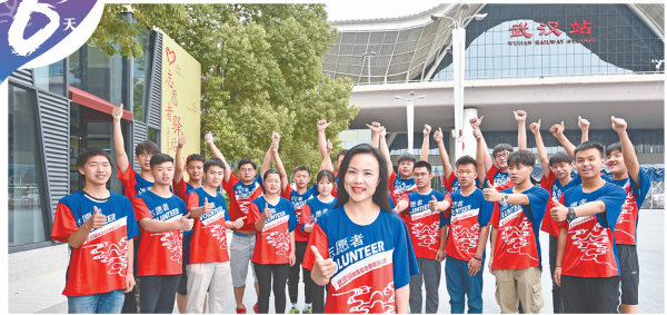 军运会地方志愿者形象大使张龙(中)带领志愿者在武汉火车站试岗