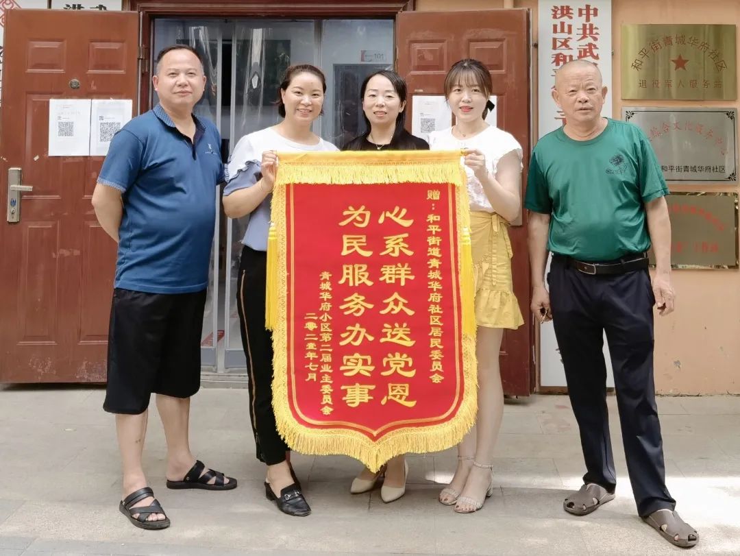 7月23日一大早,和平街道青城华府小区业委会将一面绣有“心系群众送党恩,为民服务办实事”的锦旗送到社区书记手中,对社区凝聚力量为民办实事表示感谢。