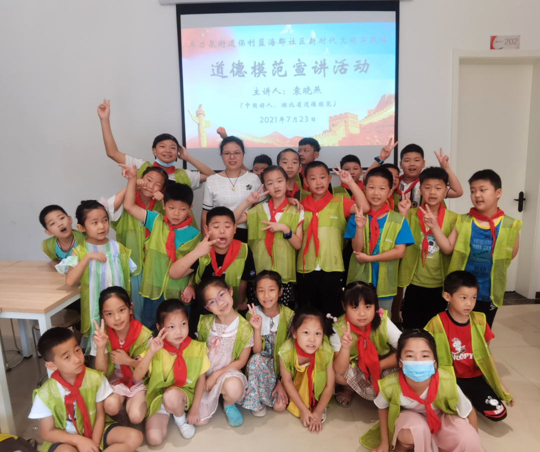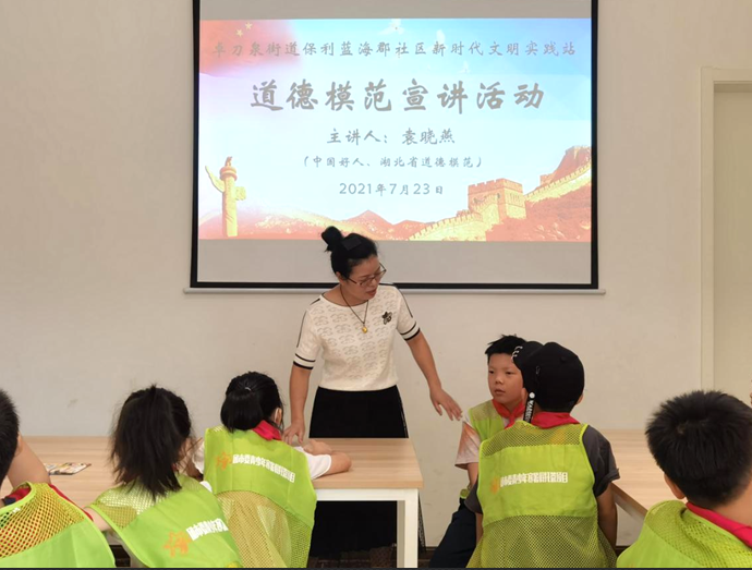 近日,全国孝亲敬老之星、中国好人、湖北省道德模范袁晓燕走进卓刀泉街道保利蓝海郡社区,为暑期托管班的青少年们上了一堂生动的道德修养课,以自己的经历为授课内容,为孩子们的心灵种下善意的种子。
