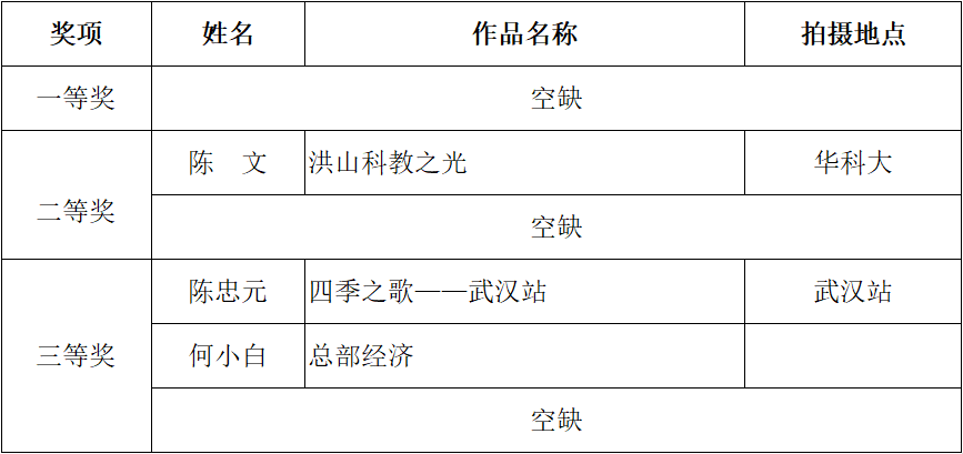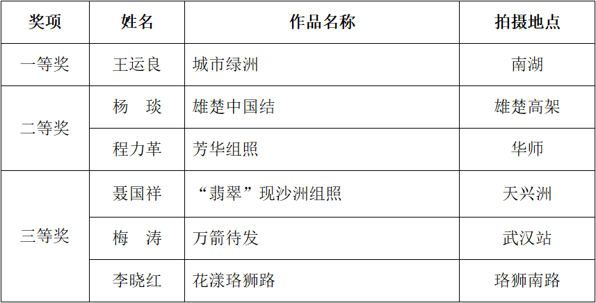 大赛先后收到图片类作品1200余件,短视频类作品20余件,所有参赛作品紧扣主题、积极向上,创作出光影洪山的美丽画卷。6月,由湖北省摄影家协会和武汉市摄影家协会评审专家组成的大赛评委会,按照公平、公正、公开原则,从主题内涵、创意构图、视觉效果、色彩搭配等方面,对参赛作品进行现场评比和点评,共评出6人作品获得图片类奖项,其中一等奖1名、二等奖2名、三等奖3名;评出3人作品获得视频类奖项,其中二等奖1名、三等奖2名(由于参赛作品数量有限,一等奖空缺;二、三等奖各空缺1名);另有60余人获评图片类优秀奖。具体获奖名单如下: