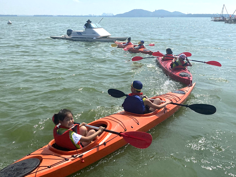 在牵引船的带领下,一艘艘皮划艇在美丽的东湖水面整齐排列。登艇、划桨,动作有模有样。尽管天气炎热,孩子们却热情高涨。2个半小时,孩子们尽情畅玩,在与风浪的竞逐中,领悟到了团结与合作的重要性,也收获了勇敢和快乐。