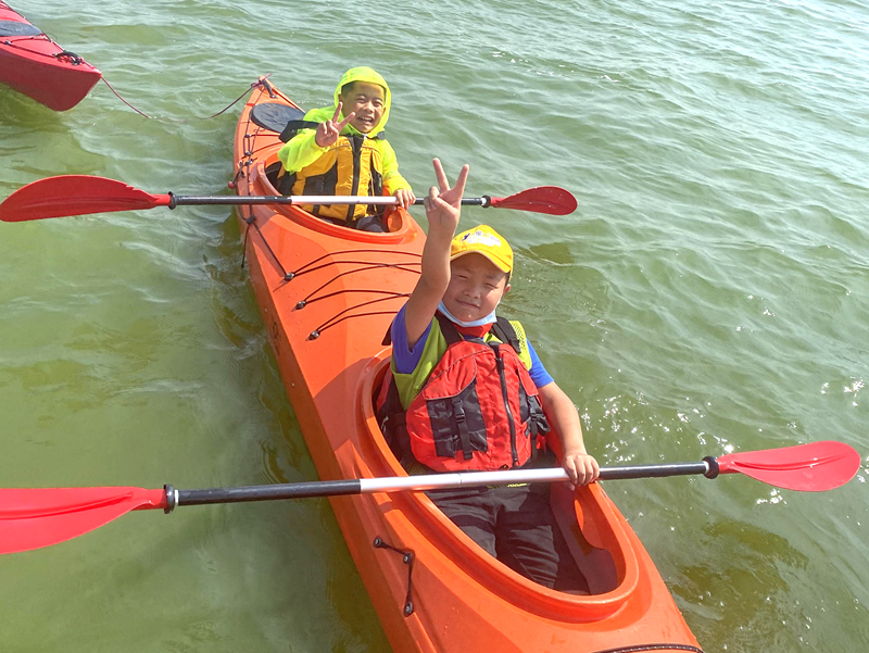 活动现场,孩子们在专业教练的带领下,学习水上安全知识,完成热身准备工作,穿好救生衣,两人一组登上皮划艇。
