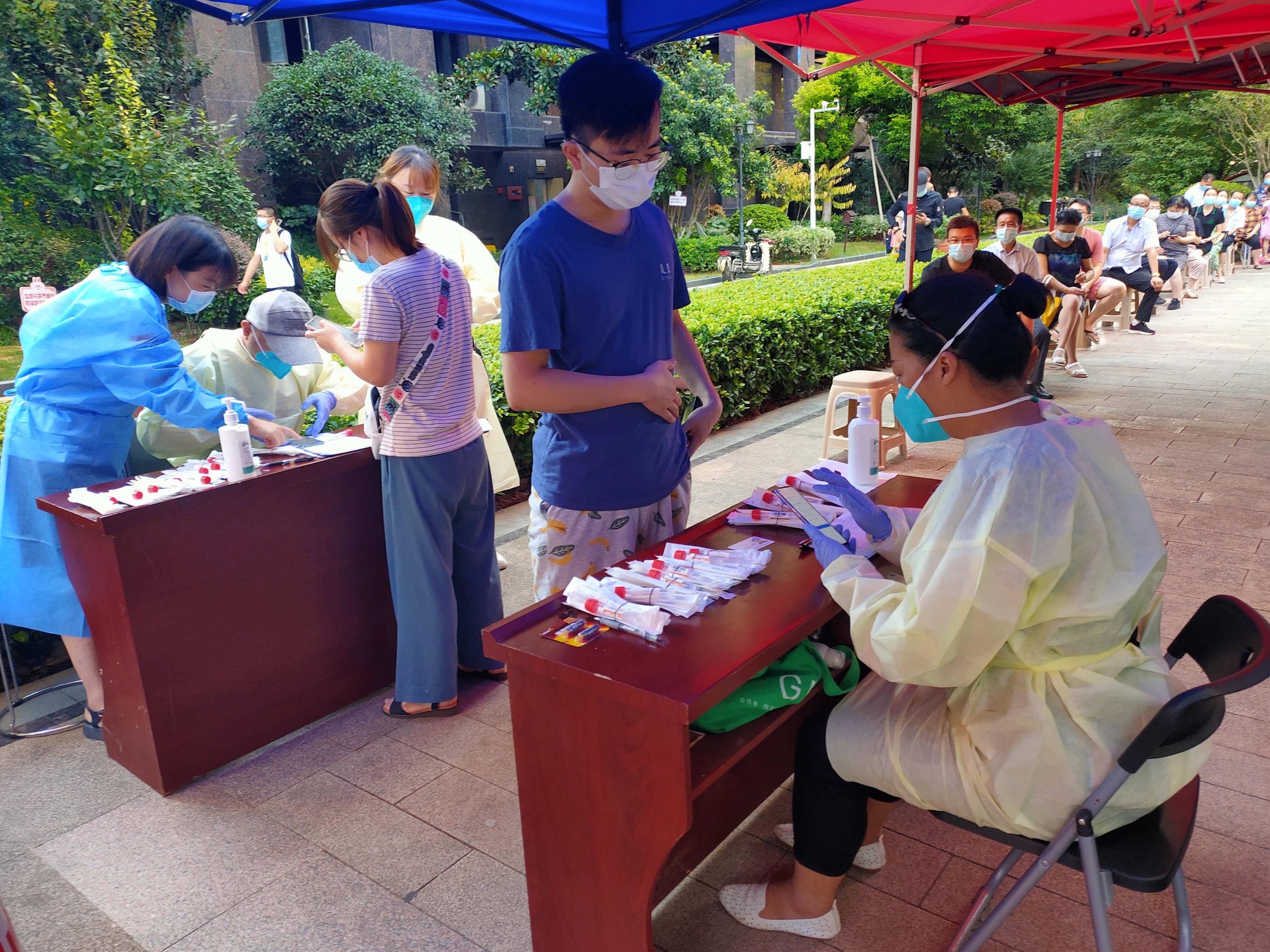 正是有这些党员的带动,彼此配合的默契,让核酸检测更加有序高效,不少热心居民不时自发送来饮料、冰棒、降温绿豆汤等,让现场所有人感受到酷暑中的清凉。“不敢困,也不能困,疫情就是命令,防控就是责任,全员核酸检测必须扎实迅速做好!”为保证核酸检测不落一人,社区书记秦红梅带领全体社区工作者已经连续奋战了十几个小时,截至4日晚,社区内核酸检测已经完成4169人。