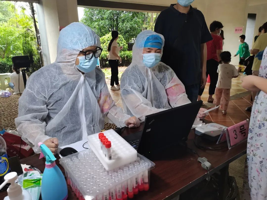 8月10日下午,天空下起了雨,科投党员们穿上雨衣,继续引导居民有序排队。“请大家做好防护,戴好口罩,保持间距,检测完毕尽快离场……”喇叭声铿锵有力、不厌其烦地叮嘱着前来检测的居民注意保持秩序。此次,林屿岸春天社区核酸检测工作从8月10日早上6点半开始,直至当晚8点结束,在医护人员、社区工作者、小区物业、科投下沉党员志愿者的通力配合下,共完成2100人次核酸检测。