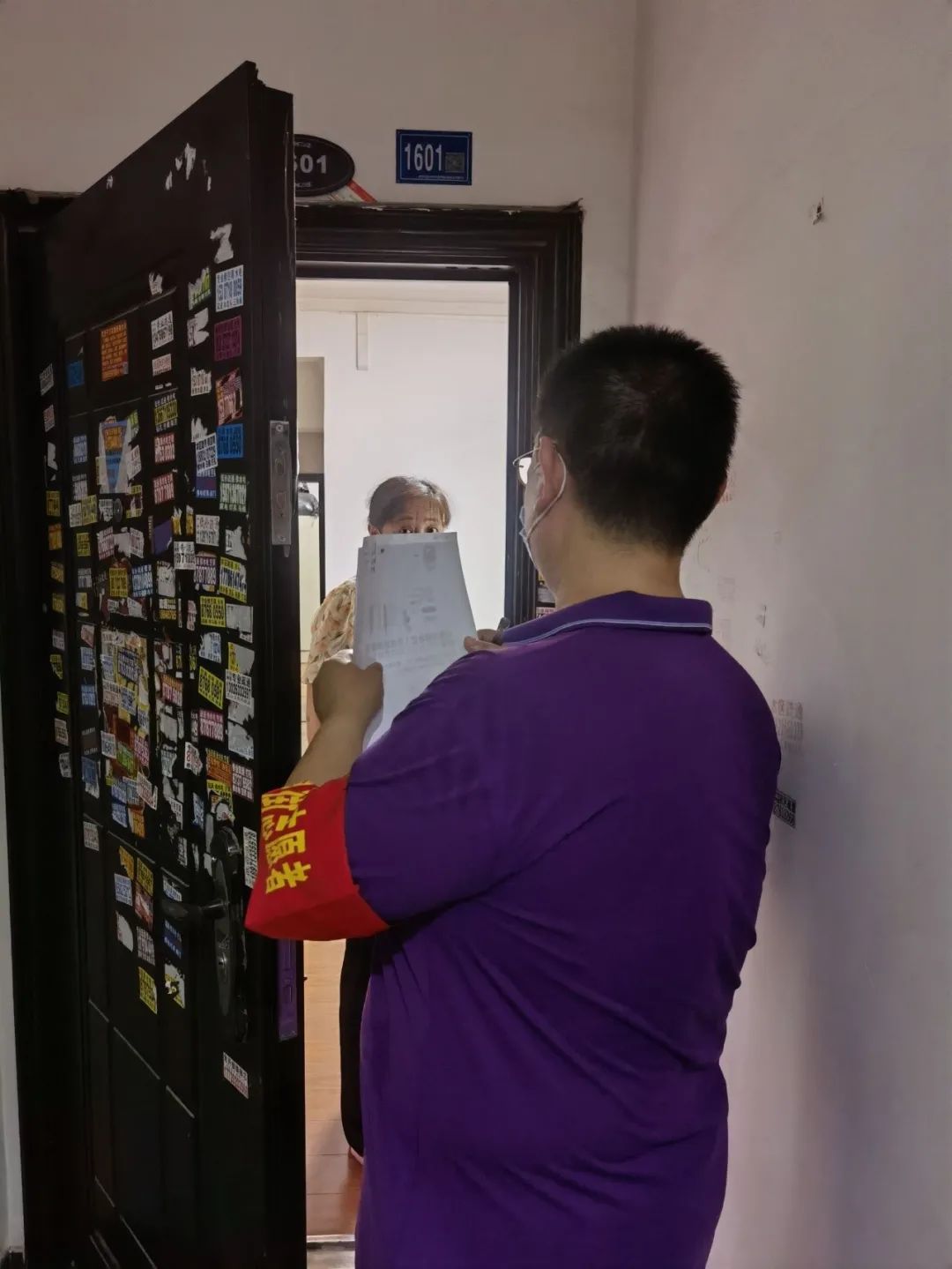 下沉党员在楼栋进行排查登记