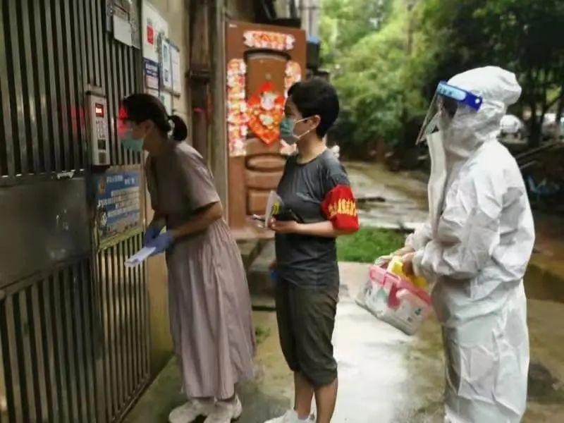 8月12日上午八点半,社区文化长廊点位和东院灯光球场点位准点开始进行核酸检测,全体工作人员和下沉党员冒雨维持秩序,在完成现场居民采样的同时,安排社区工作人员跟随洪山区中医医院的医务人员上门,共为28位高龄、独居老人采样。其中有一位百岁老人,社区还特别安排了校医院有丰富上门经验的陈筠医生以及东院离退休工作处的主要负责人一同服务。