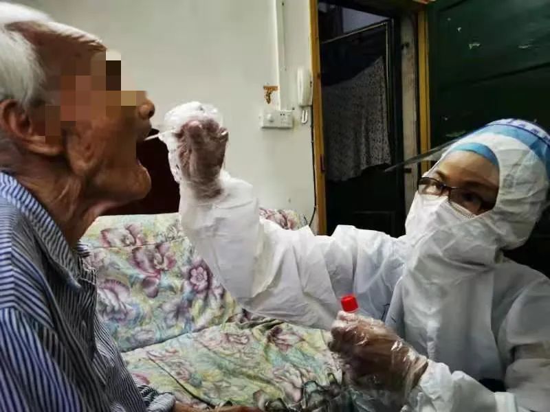 陈筠医生仔细核对老人信息,用手机进行网络录入,一切准备就绪,做手部和现场消毒,便拿出提前准备好的新冠病毒核酸检测采样管,和蔼地提示老人头部后仰张嘴。陈筠用棉棒越过舌根,在老人咽部擦拭。取样后,她轻柔地将棉棒插入写有姓名及编号的采样管,顺势把棉棒折成两截,一截留在管内,另一截丢进黄色塑料袋中,迅速盖好盖子,采样结束。再次现场消毒,陈筠连口水都顾不上喝,带上现场医废就向老人和家人告辞,因为学校3处现场采集点还有大量工作等着她处理。