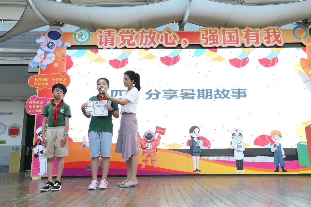 “在庆祝中国共产党成立100周年大会上,千余名共青团员、少先队员代表为伟大的中国共产党致献词给我留下了深刻印象。”“这个暑期最让我难忘的就是奥运会,祖国的奥运健儿表现真是太棒了。”暑期故事分享环节,6名学生代表逐一分享暑期精彩瞬间,“收获”“成长”“幸福”“爱国”等成为分享的关键词。