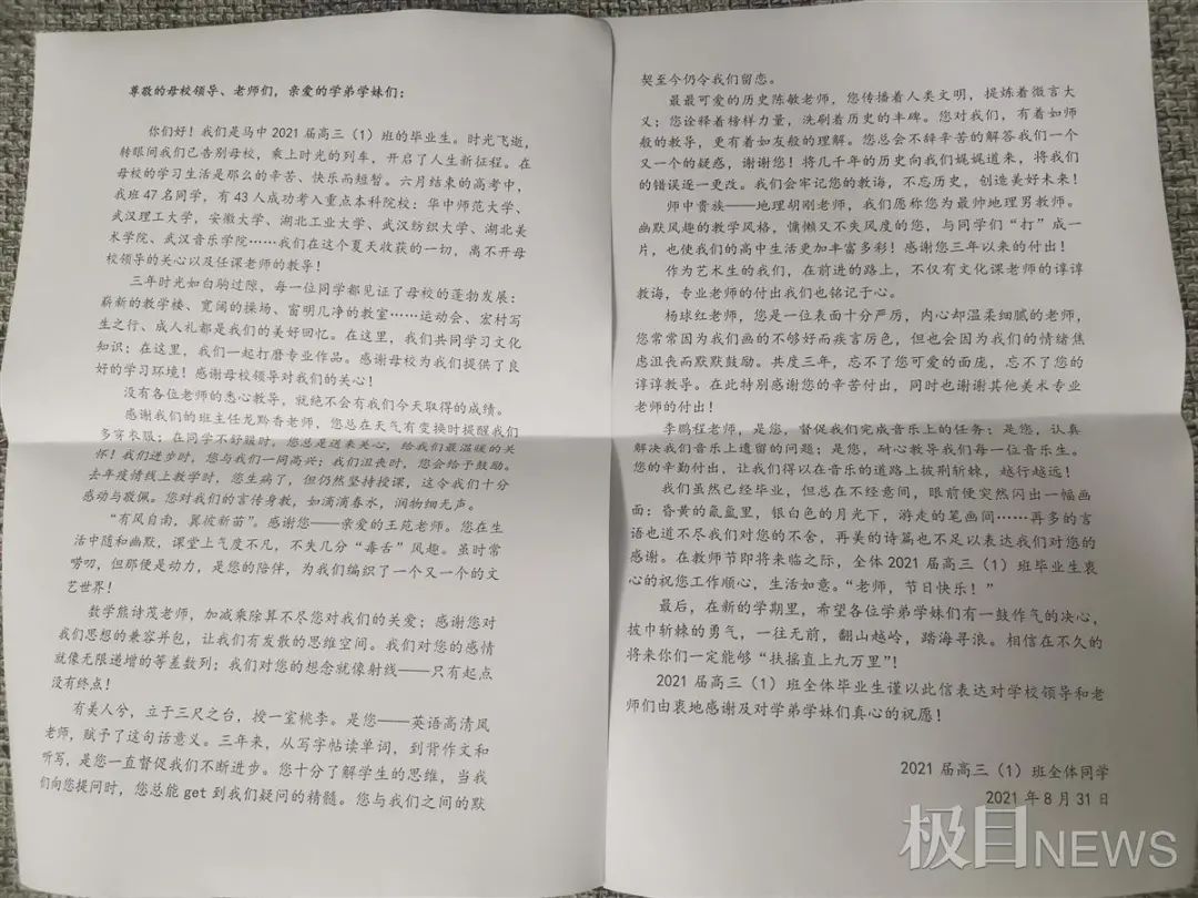 9月1日开学当天,不少老师都给学生准备了新学年的“见面礼”。武汉市马房山中学原高三(1)班的老师却收到了学生的特别礼物——刚刚送走的2021届毕业班47名学生,通过快递寄来了一封感谢信。