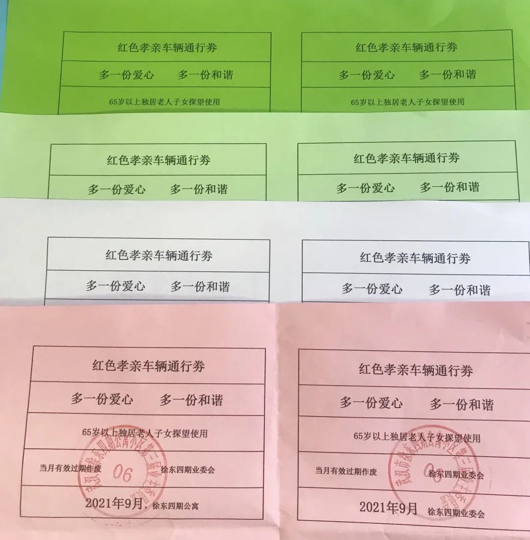 中秋节前夕,家住徐东四期公寓小区6栋2单元的徐婆婆,收到了送来的4张本月“孝亲车辆通行券”。“领了这个停车券,我每个月就惦记着女儿回来,反正停车不要钱,她也可以多待一会儿。”今年78岁的徐婆婆笑着说,月底老伴如果发现这个孝亲停车券没有用完,还会和女儿开玩笑提醒她。