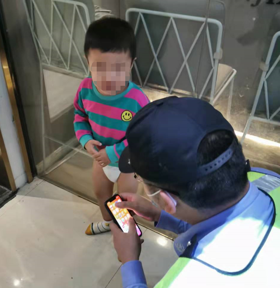 民警走访一楼各酒店前台无果后,前往物业调取监控,发现小孩是独自一人从11楼乘坐电梯下来的。由于楼道没有监控,民警抱着小孩挨家挨户寻找,终于找到了孩子的父亲李先生。