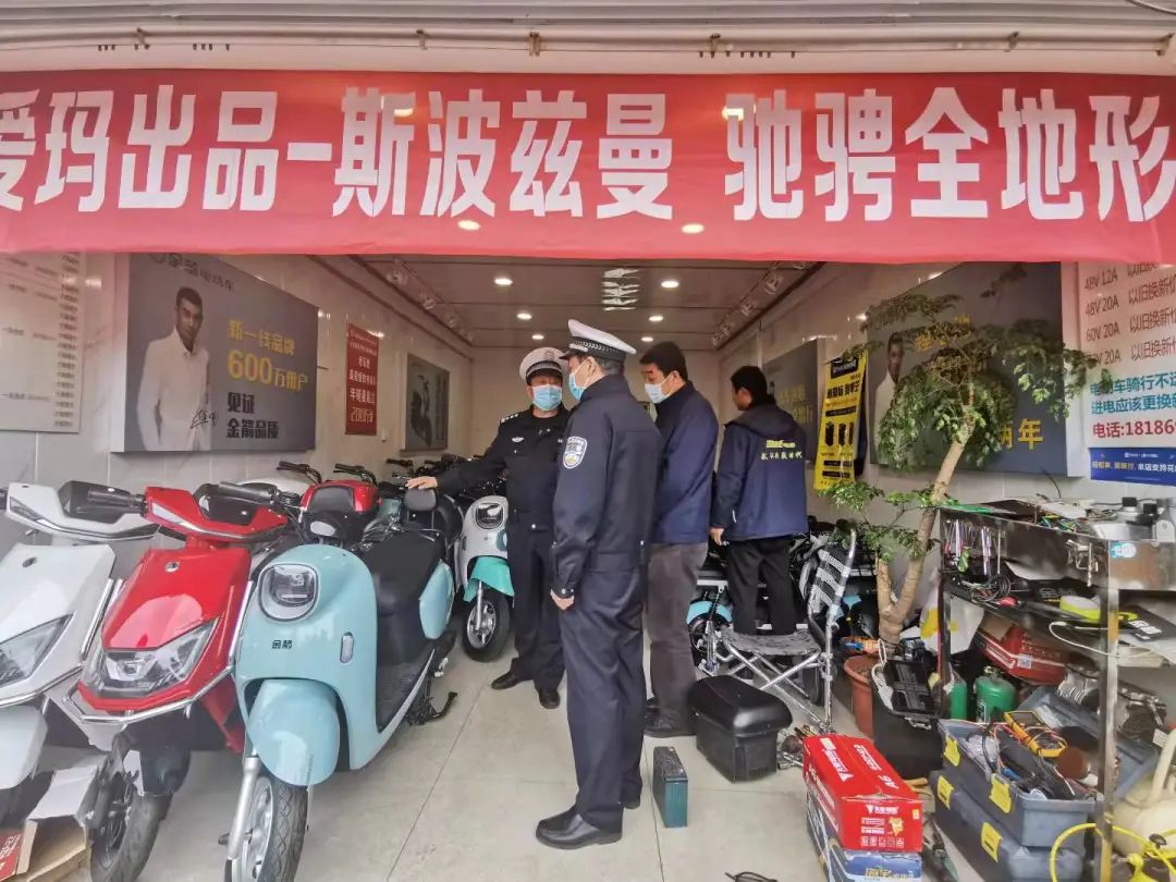 为配合全市电动自行车交通秩序整治,加大对电动自行车源头违法违规行为的监管力度,当天上午,由洪山区交通大队联合区各职能部门共同成立的洪山区电动自行车综合整治执法队,走进辖区卓刀泉、南湖片区的电动车销售点,开展专项检查和交通安全宣传。