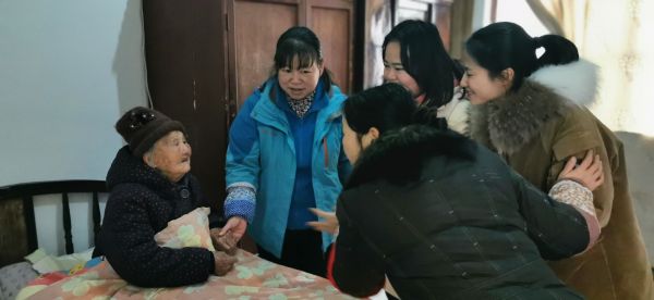 莲溪寺社区网格员与辖区“双进双服务”单位丁字桥幼儿园的党员代表们一起去看望涂家岭八村的百岁孤寡老人,为她送去了牛奶、米和油等慰问品。(雷娟娟)