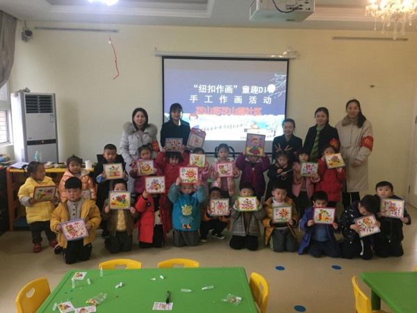 1月14日,花山街花山郡社区携手花山万科赛诺幼儿园开展了“纽扣作画”童趣DIY手工活动。(肖会理)