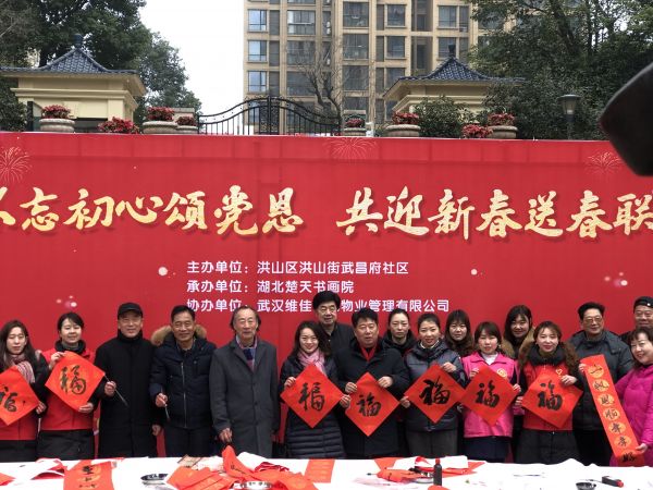1月14日上午,武昌府社区邀请湖北楚天书画院书法家开展“不忘初心颂党恩 共迎新春送春联”活动。(兰茜)