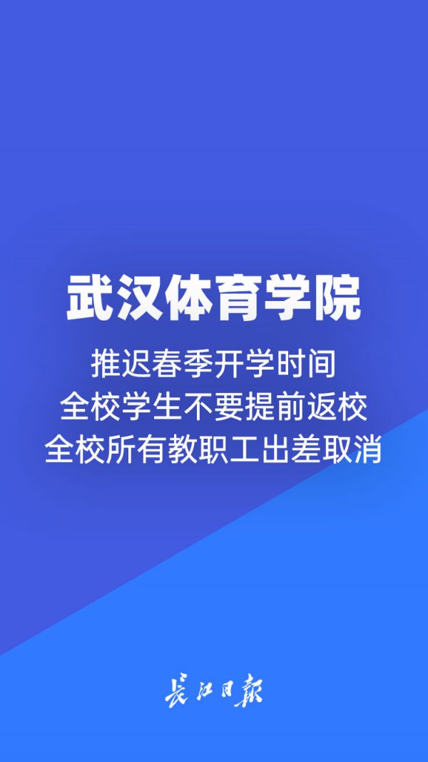 武汉大学通告称,根据湖北省新型冠状病毒感染的肺炎疫情防控指挥部通告精神及教育部相关意见,学校决定推迟春季开学时间。通告要求师生主动配合学校所在单位做好健康状况报告等工作,尤其是要及时报告被确诊、疑似或隔离观察的情况。在汉教职工尽可能待在家,原计划返校的学生(包括家在武汉市内的学生)暂时不要返回学校,在校学生尽可能少出宿舍,合理安排作息,最大程度减小感染风险。