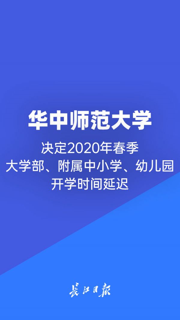 华中师范大学今天发布通告称:决定2020年春季大学部、附属中小学、幼儿园开学时间延迟,具体开学时间另行通知。学校将根据延迟开学时间,调整下学期教学安排。同时要求全体师生积极响应、遵守当地新型冠状病毒感染的肺炎疫情防控指挥部的号召和要求,及时采取防护措施,养成良好卫生习惯,尽量减少不必要的外出,团结一心、共渡难关。