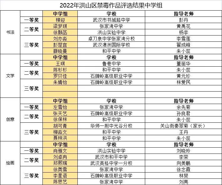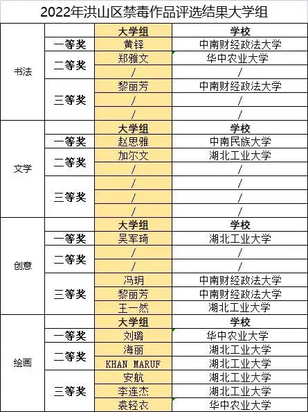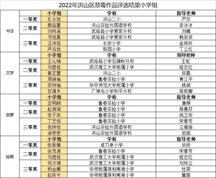 近日,记者从洪山区禁毒办获悉,2022年全区禁毒主题绘画、书法、文学、创意类作品征集评选结果揭晓,四个类别的小学组、中学组、大学组各评选出一等奖、二等奖、三等奖,以及优秀奖若干名。
