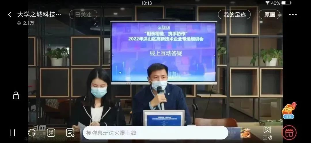 在直播间,区科经局产业发展科工作人员为参会企业介绍了全区高新技术企业发展现状,讲解了洪山区2022年高新技术企业认定实地核查工作相关要求以及在实地核查中发现的问题,同时线上帮助企业梳理和解答了申报过程中遇到的常见问题,强调了2023年高新技术企业认定申报的注意事项。