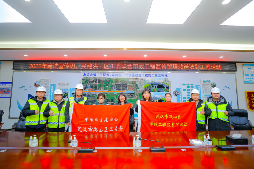 12月6日下午,洪山区建设局下属二级单位——洪山区市政工程监督管理站联合民建洪山区工委,在友谊大道(三环线-宏茂巷)快速化改造工程施工第五标项目部组织开展送法到工地网络直播活动。民建洪山区工委会员、湖北立丰律师事务所律师夏爱华为参建单位人员进行线上线下“宪法宣传日”普法宣讲。