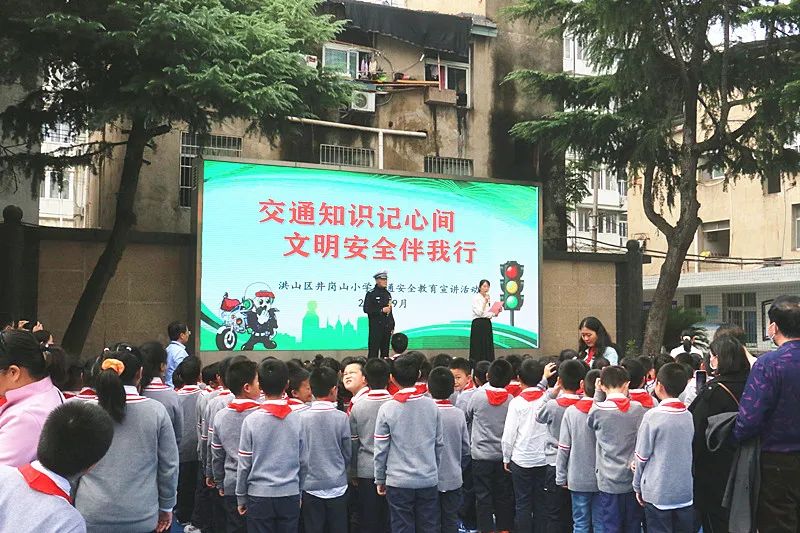 为进一步普及交通安全常识,提高小学生交通安全意识和自我保护意识,当天上午,洪山区交通大队车管中队民警走进井岗山小学,开展主题为“交通知识记心间 文明安全伴我行”的交通安全教育宣讲活动,通过“宣讲+体验+互动”的方式为同学们带去一堂生动有趣的交通安全课。