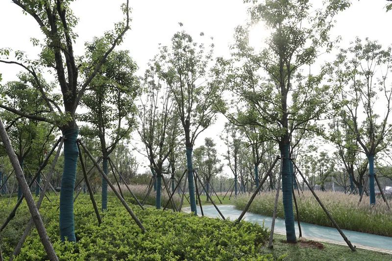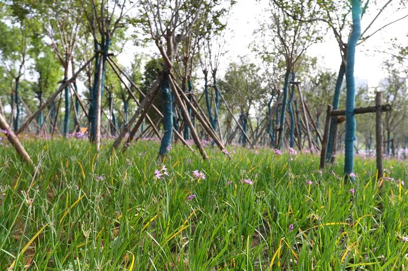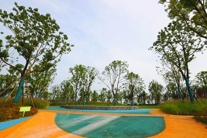 记者看到,该公园以“林”为特色,香樟、重阳木、三角枫、栾树、桂花、乌桕次第生长,林下种植的柳叶马鞭草花海点缀其间,颇为壮观。