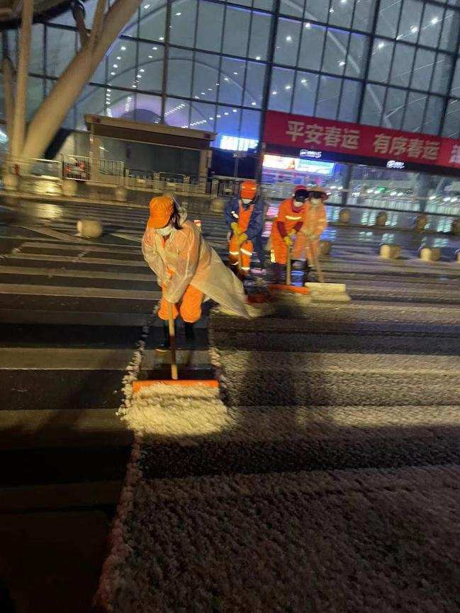 针对低温雨雪冰冻天气,完善应急预案,强化预报预警,储备应急人员、物资、设备,站区办对融雪防冻准备情况进行专项检查,逐一查看融雪防冻物资、设备情况,核对应急人员,确保人员、物资可随时调用。应对1月14日-15日的寒潮降雪天气,出动突击队员95人,撒盐车辆3台、撒融雪剂12吨,对东西广场、公交站台等地铺设麻袋1000条,对东西高架及主次干道进行了8轮不间断撒融雪剂,防止结冰打滑,确保武汉站东西高架及主干道通行正常。