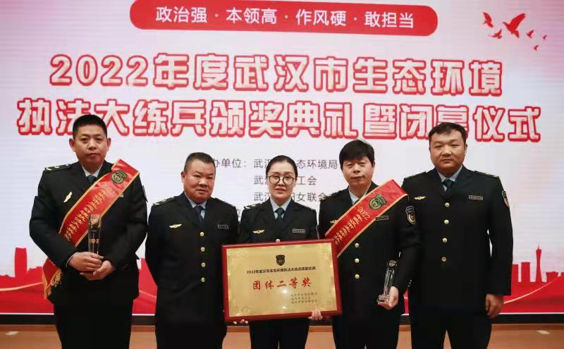武汉市生态环境保护综执法支队七大队(洪山)由专职副大队长张平带队,邰晨、田金明、喻红敏、刘将四名退役军人组成参赛队伍参加。经过现场执法能力测试、典型案例分析、非现场监管技术应用、理论知识测试4个环节的全面比拼,最终荣获执法大比武团体二等奖。同时,邰晨荣获个人一等奖,喻红敏荣获个人三等奖。