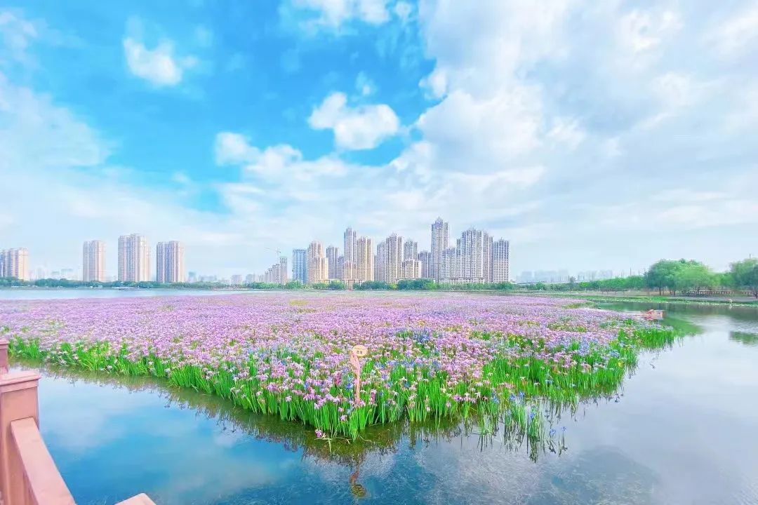 到了初夏,五彩斑斓的鸢尾漂浮水面;而到了盛夏,素洁典雅的荷花亭亭玉立。