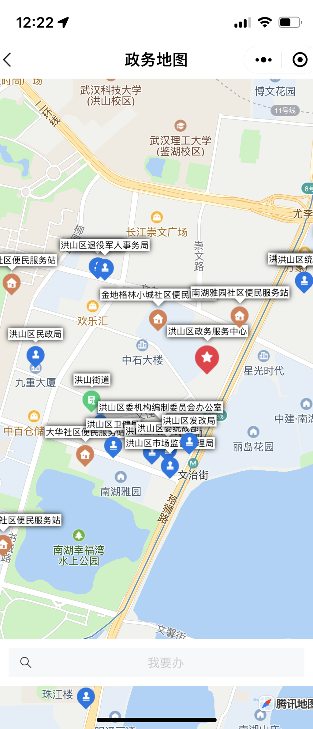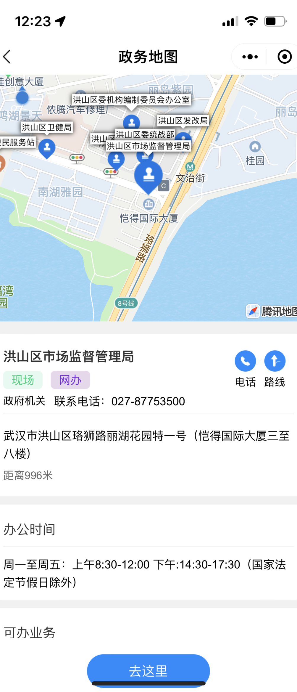 记者体验发现,只需在微信小程序中搜索“洪山政务”,进入首页即可看见“政务地图”标识,点击进去地图显示所在地理位置,放大地图还可以看见周边站点资源信息。在底部对话框中输入“我要办”的具体事项,地图便自动就近推荐站点。选定服务站点之后,里面不仅有联系电话、前往路线、具体地址、办公时间以及可办业务等信息,还可以选择现场办理或者网上办理。