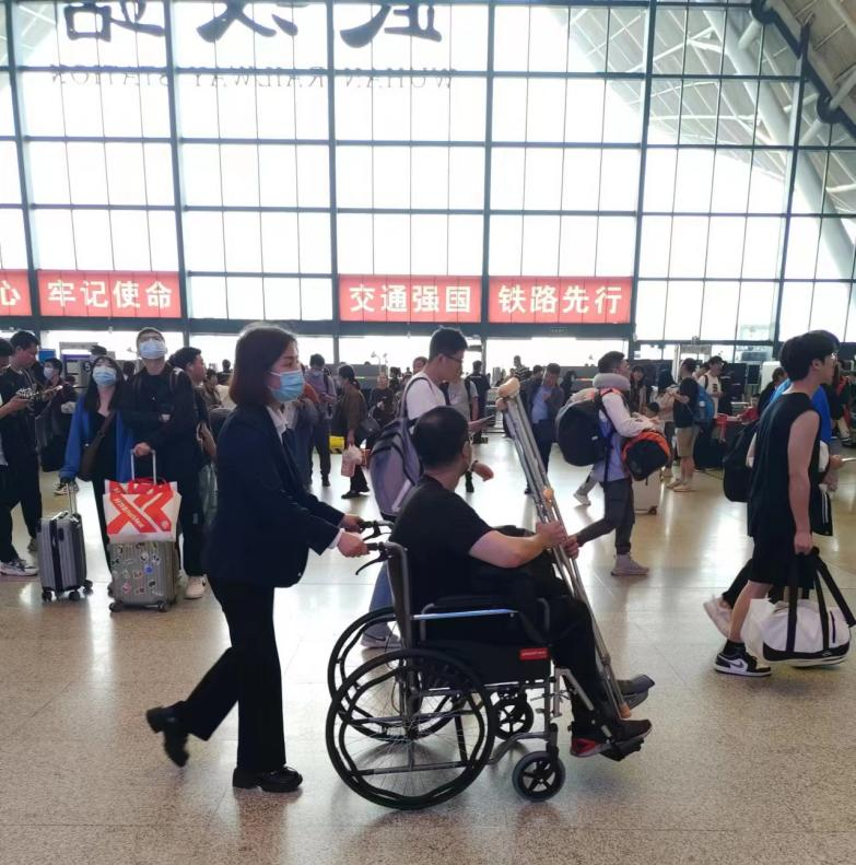 5月1日下午3点左右,专班人员接到12306重点旅客工单预约服务:一名腿脚不便的旅客要乘坐到上海虹桥的列车,需要提供轮椅帮扶进站。工作人员提前打电话联系旅客,提前在东进站口等候,为旅客开启人工通道,护送旅客进站检票,并送上列车。这是站区办开展的一项文明接驳服务。据统计,小长假期间,文明接驳专班累计帮扶重点旅客进出站60余次。