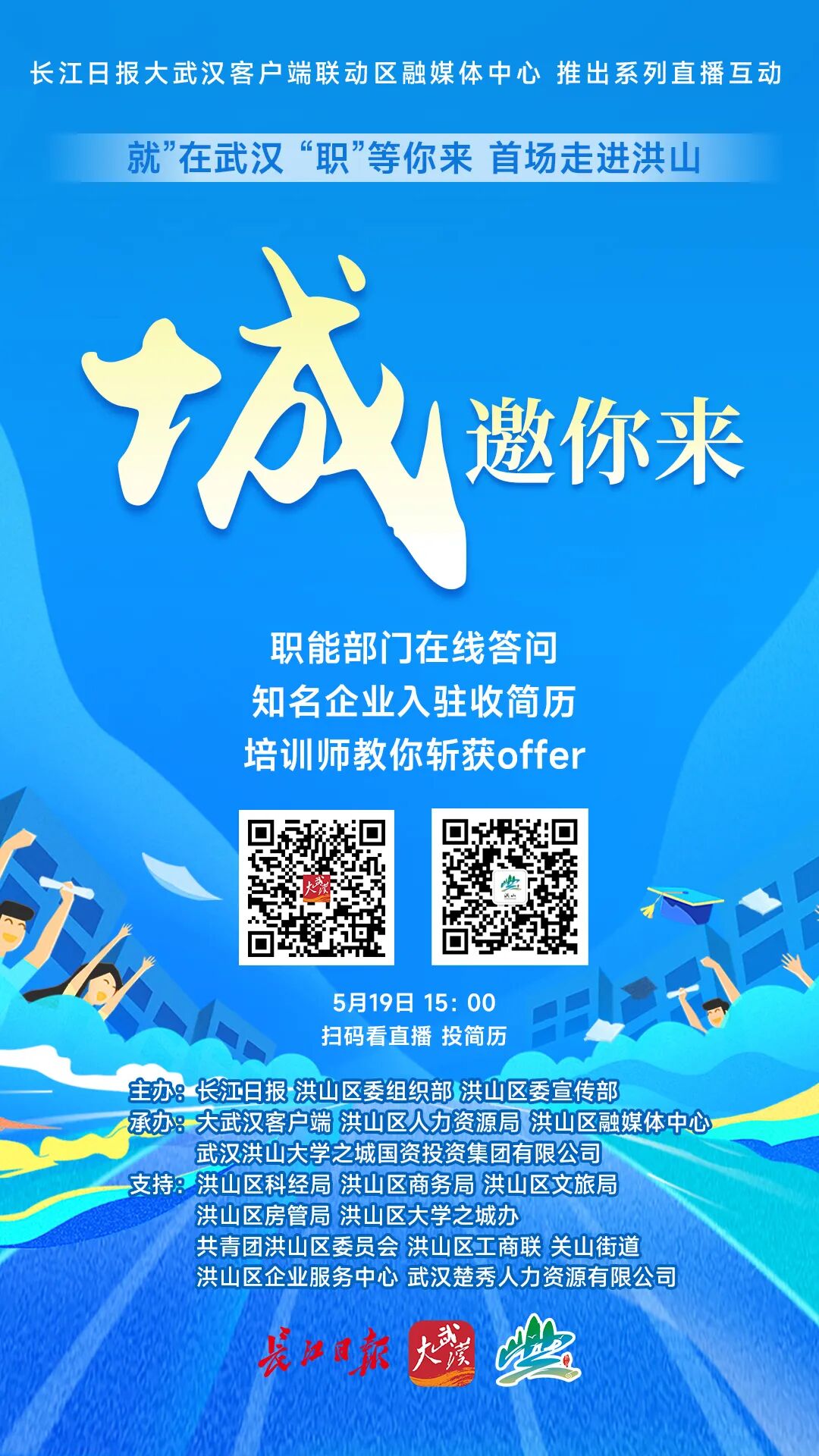 5月19日,由长江日报、武汉市洪山区委组织部、宣传部联合主办的2023年“‘就’在武汉 ‘职’等你来”暨洪山·“城”邀你来大型系列直播互动活动火爆开启。首日启动专场和城市形象展示专场相继进行,共吸引超3000余名学子线上线下参与互动,网络直播点击观看人数超百万人次。