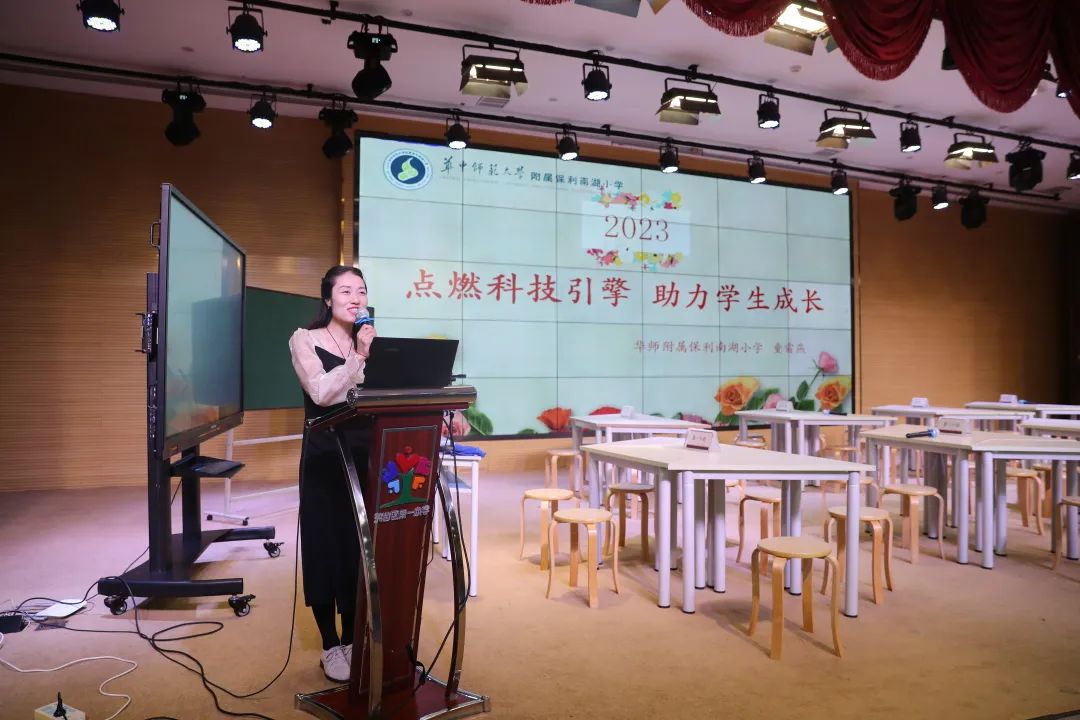 教材教法报告会上,华中师范大学附属保利南湖小学童雷燕老师以《点燃科技引擎 助力学生成长》为题,围绕“心系学生,瞄准学情;开放思维,活用教材;优化策略,实效为王”三个方面进行分享。她认为,科技教学活动不是“给出好答案的教学”,而是学生能提出好问题的教学,要让科技制作活动课堂形成“思考输入→实践成长→输出思维”的成长闭环。
