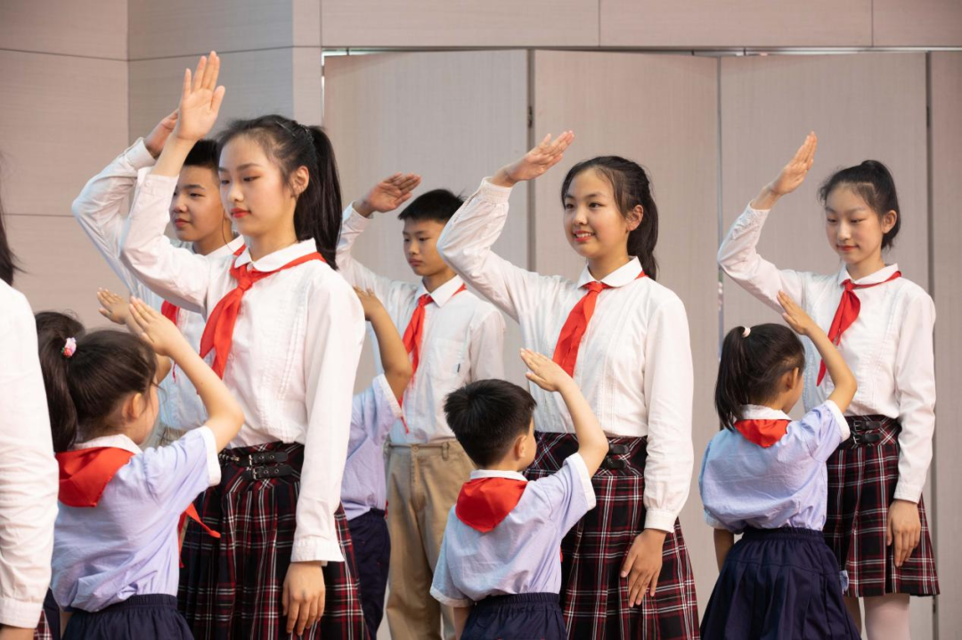 在雄壮的《出旗曲》中,少先队入队仪式拉开序幕,旗手与护旗手迈着整齐的步伐,擎旗走出。少先队员们用手语“齐唱”《中国少年先锋队队歌》,传递着队员们对少先队组织的热爱与向往。