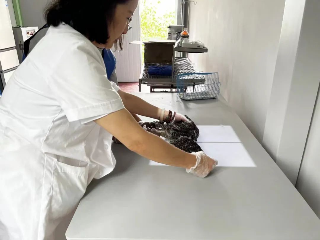 经过救护基地兽医师的检查,红隼幼鸟羽毛完整,无明显外伤,X光片显示骨骼正常。医师诊断红隼幼鸟应是受近日强对流天气影响,从树上坠巢的1个月左右的幼鸟,尚未具备飞行能力,没有充足的食物补给,体质较为虚弱。随即,医师进行了喂食、喂水等措施,计划待其能飞后便放生自然。