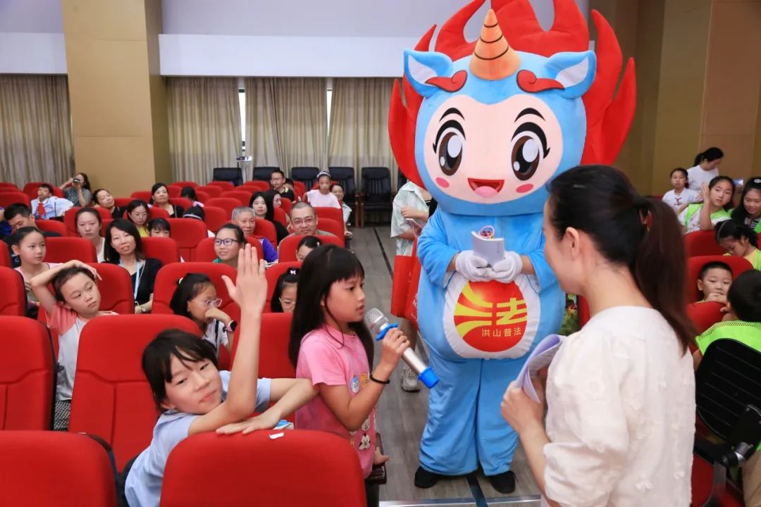 “未成年人每日什么时间段不能上网玩游戏?”“为了节省时间,可以让孩子骑自行车过马路吗?”“孩子七岁了,自理能力强,家长都忙,让他自己一人在家可以吗?”洪山区司法局为孩子们带来了有奖问答,吉祥物“洪小法”为答对问题的孩子送上小礼品,与孩子们互动拍照。