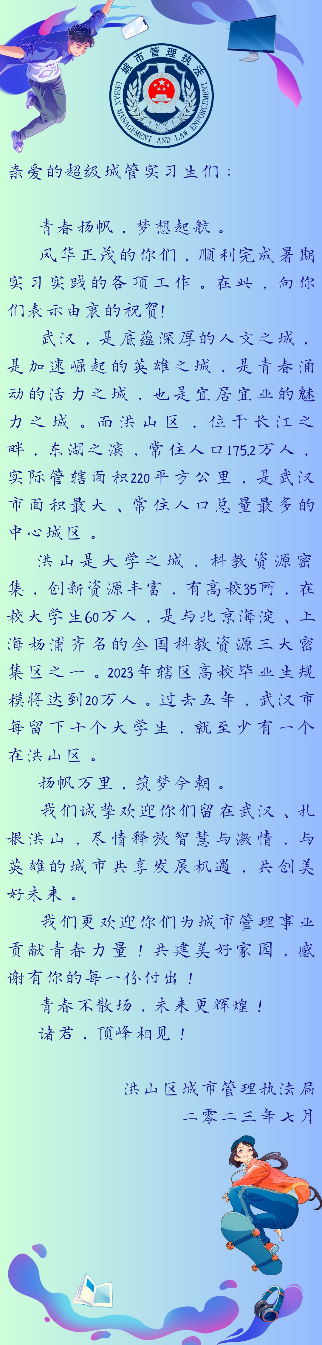 洪山区城管执法局的这段宝贵实习经历让我学技能、长见识、增阅历,更让我对“城管”这个词有了全新的认识,我想这就是此次实习的意义,也是我最大的收获。