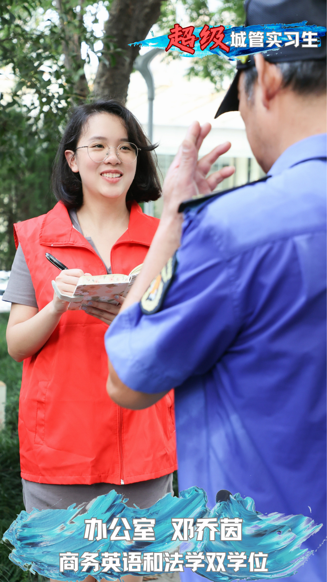 此次实习是我对课本外社会百态的启蒙,非常感激所有指导我的城管“老师们”。我也将继续在了解群众生活中形成正确的社会观察,全面提升社会化能力,到祖国最需要的地方建功立业,为国家发展繁荣注入强大青春动能。