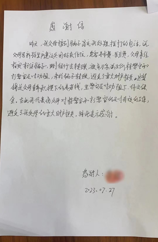 7月27日,桂军从老人家属送来的感谢信中得知,二老已经意识到上当受骗了,对此事仍心有余悸,在此向警方和银行及时而耐心地劝阻表示感谢。