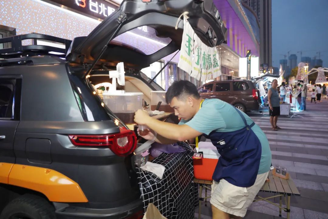 在传统夜市的基础上,金地趣街还引入“车尾箱”夜市。10余台汽车后备箱被打造成一个个微缩版的精致商店,甚至是创意工厂,极具个性——手作好物、咖啡甜品、日用杂物、古着服装、潮流配饰……每一个“后备箱”都售卖着不同的产品,吸引着市民游客驻足。