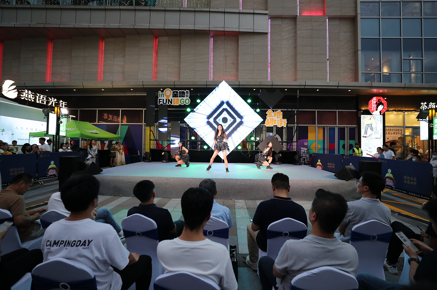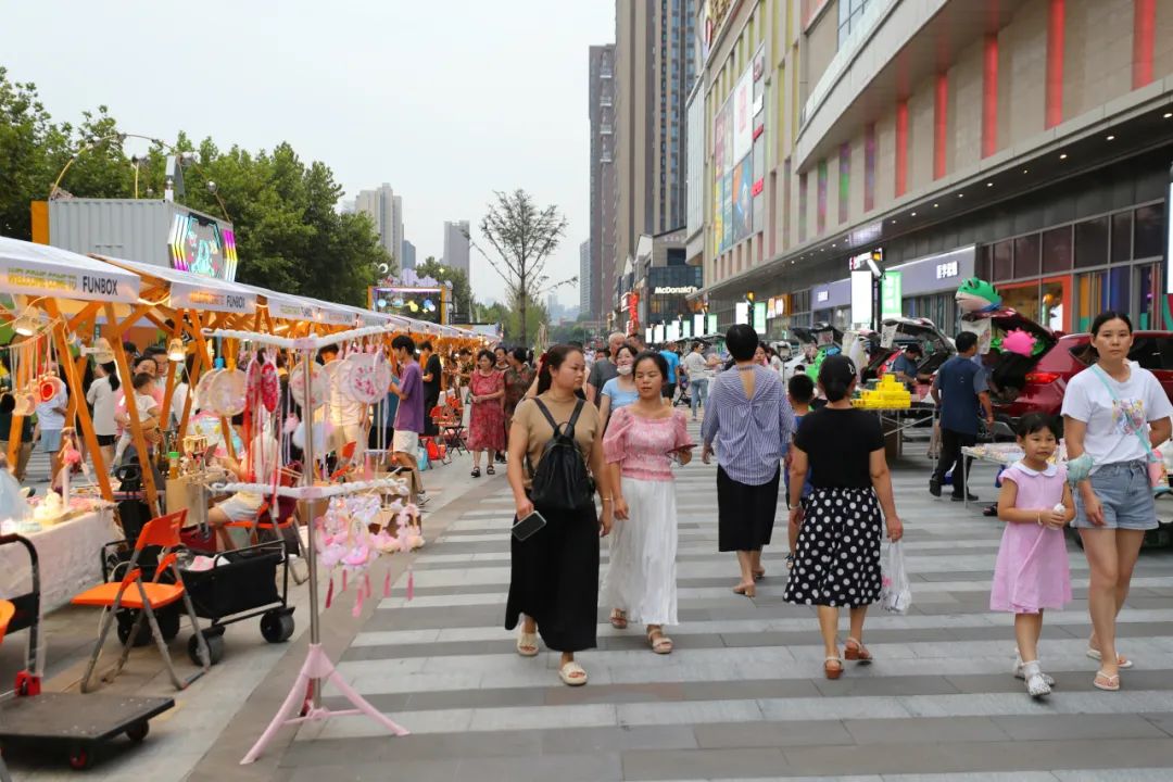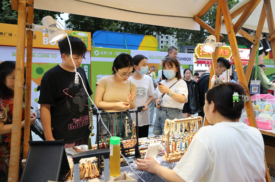 夜幕降临,华灯初上,整齐划一的摊位在金地广场一字排开。摊主的叫卖声、游客的交谈声、“趣玩电音趴”的音乐声此起彼伏,各色招牌光影交错,各种美食琳琅满目,各类小商品创意新潮,灯光璀璨中人潮涌动。市民游客赏夜景、逛夜市、品美食、看电影,沉浸式体验家门口的人间烟火。