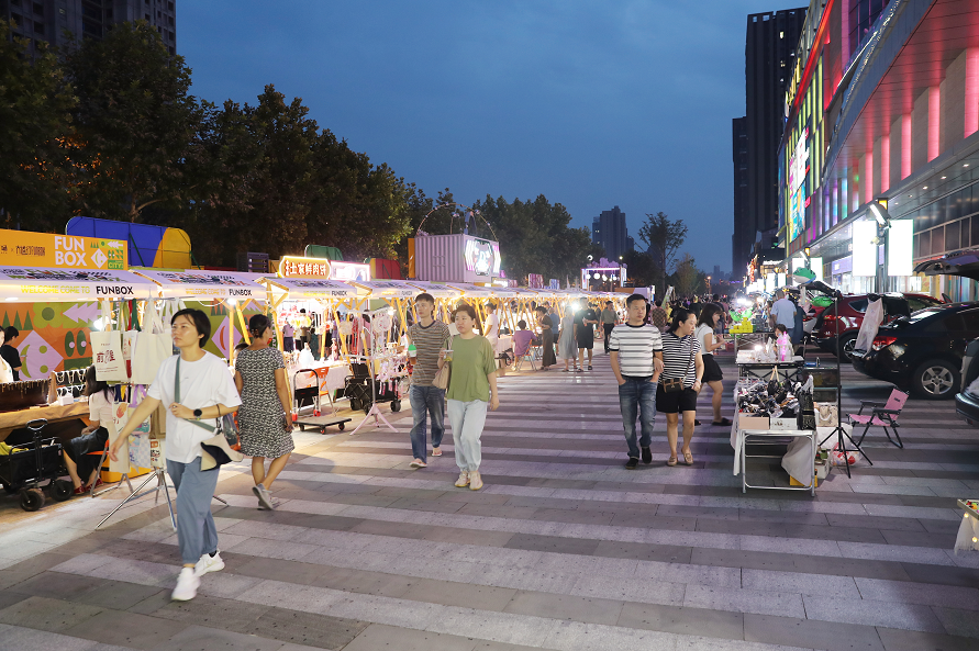 “夜集市”点亮“夜经济”。8月25日晚,位于洪山区和平街道仁和路的武汉金地广场夜经济街区——FUNBOX金地趣街正式开街迎客。不拘一格的市集风格,格调满满的街景氛围,仿佛打开了城市的另一面。