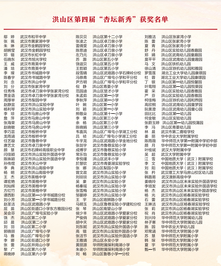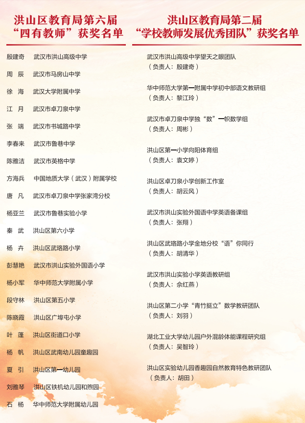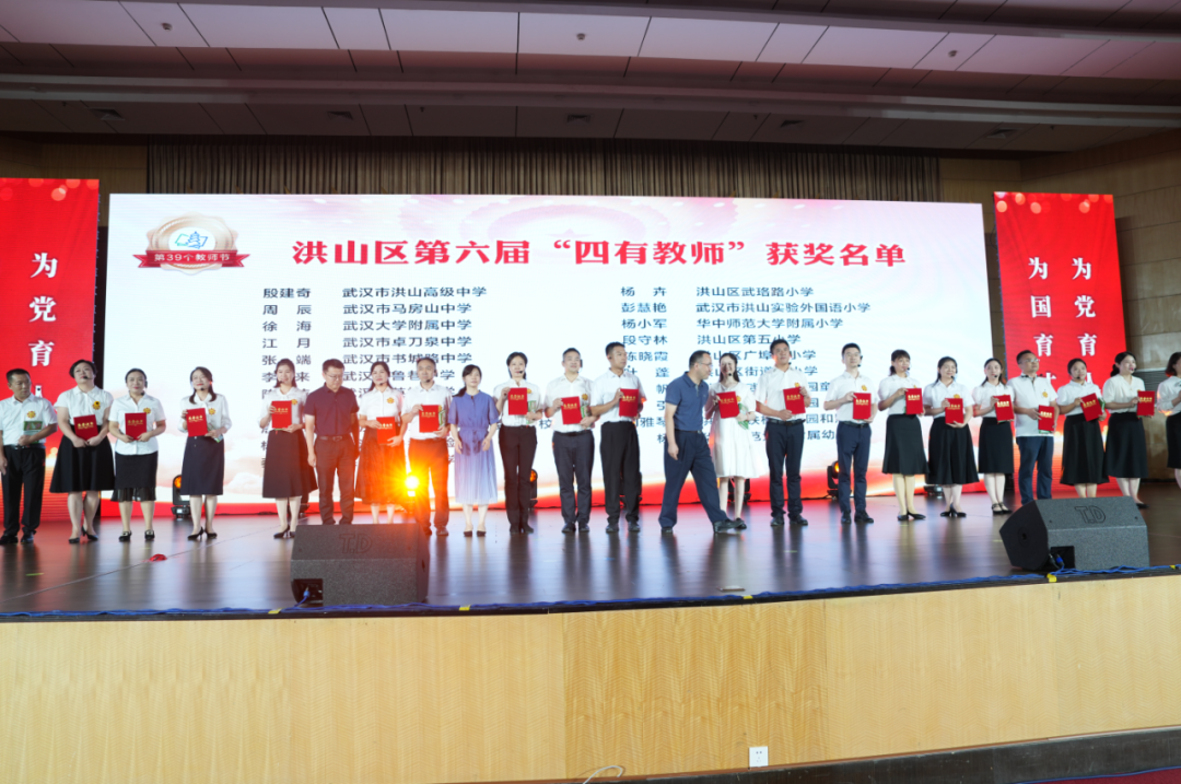 今年,洪山区共有21名优秀教师获评洪山区第六届“四有教师”荣誉称号,11个优秀教师团队获洪山区第二届“学校教师发展优秀团队”称号。