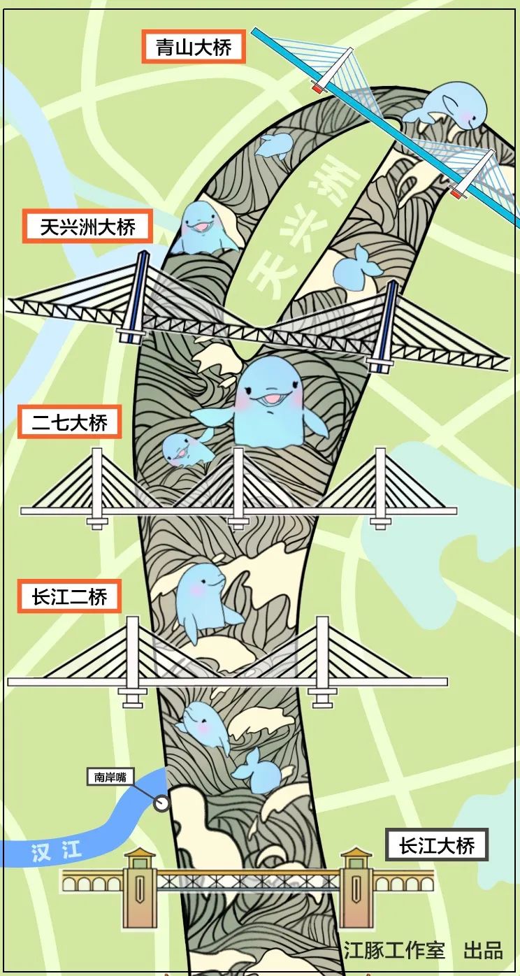 近些年,在天兴洲集聚的江豚数量逐年增长,这里有着武汉数量最多的江豚族群,越来越多的江豚选择在这里“定居”和繁衍后代。