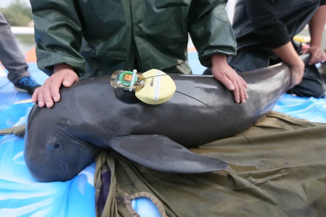 科研人员给江豚体检后,戴上行为跟踪仪器。