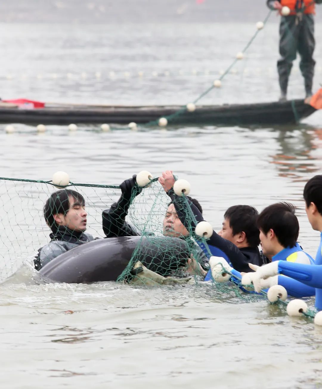 2014年1月10日,在天兴洲北汊水域,渔政人员和科研人员经过寻找打围、临时安置、拖运上船、仔细体检等环节,组织解救这2对被困江豚。长江日报记者高宝燕全程见证记录,一组精彩图片目击式还原当年的救助场景。