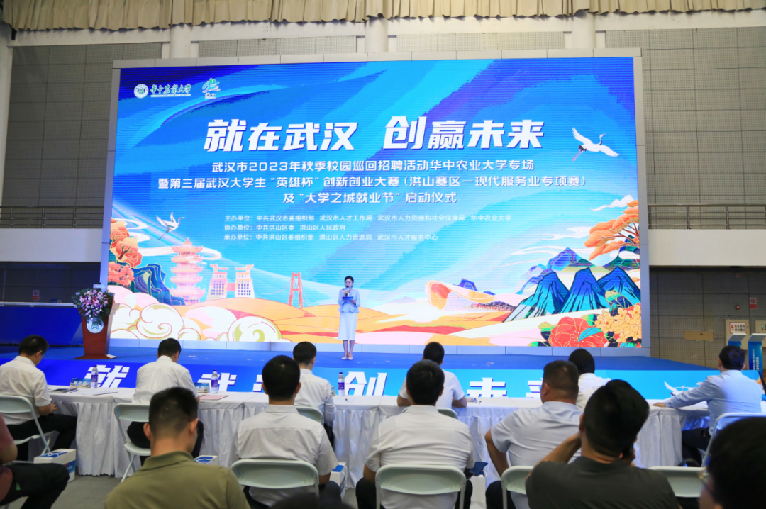 9月19日,“就在武汉 创赢未来”武汉市2023年秋季校园巡回招聘活动华中农业大学专场举行。活动现场,洪山区人民政府党组成员、副区长袁永康宣布第三届武汉大学生“英雄杯”创新创业大赛现代服务业专项赛在洪山区启动。